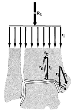 The forces that act on the ankle joint are shown in Figure 2. The bones that make the articular surface of the ankle joint are subjected to stress along their vertical axis by the resultant force Rt. The resultant force Rt can be divided into equal partial forces ri.. Each partial force ri has 2 components: a normal force rn and a tangential force rt. The articular surfaces are subjected to only normal forces, rn. At the medial malleolus, the normal forces rn are smaller than at the trochlear surface. At the fibular malleolar articular surface with vertically orientated articular space, no articular pressure arises from the partial force ri, because rn is zero (Tillmann et al. 1985). The loading by tensile forces is of greater magnitude in the lateral area of the joint (fibular malleolus). Tillmann et al. (1985) describes that the bony elements of the ankle joint have adapted to the distribution of stress in the ankle joint through the distribution of osseous material in the subchondral bone and by the cancellous architecture. It describes that results from photoelastic model tests reflect such findings when they are subjected to stress by both compressive and tensile forces. Tillman et al. (1985) describes that, ‘’Zones with high fringe orders of isochromatics in the model correspond to area with high density of the osseous tissue in equidensity pictures, and the trajectorial pattern in Plexiglas models mirrors the alignment of compressive and tensile cancellous trabeculae’’.